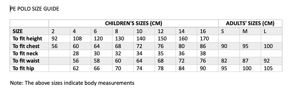 This polo is worn each day your child attends the ELC. Recommended to buy 1 x PE Polo for each day. Refer to the product images or see the size guide below for sizing.